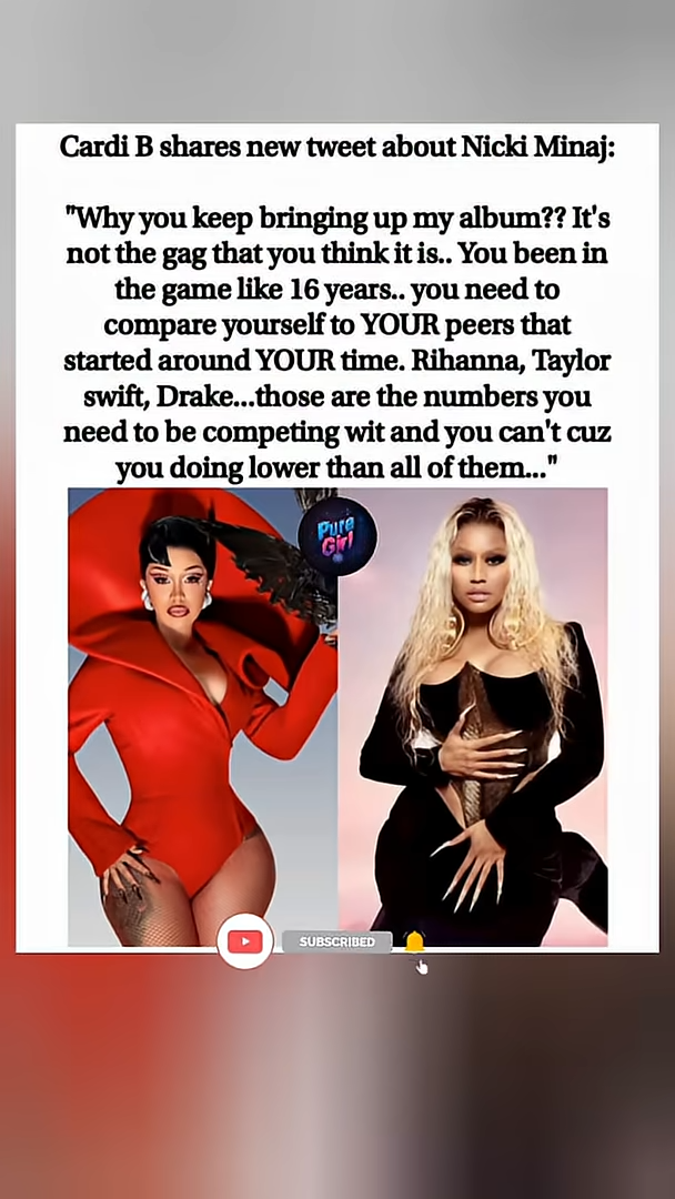 Cardi B to Nicki:”You need to compare yourself to YOUR peers… Rihanna, Taylor Swift, Drake.